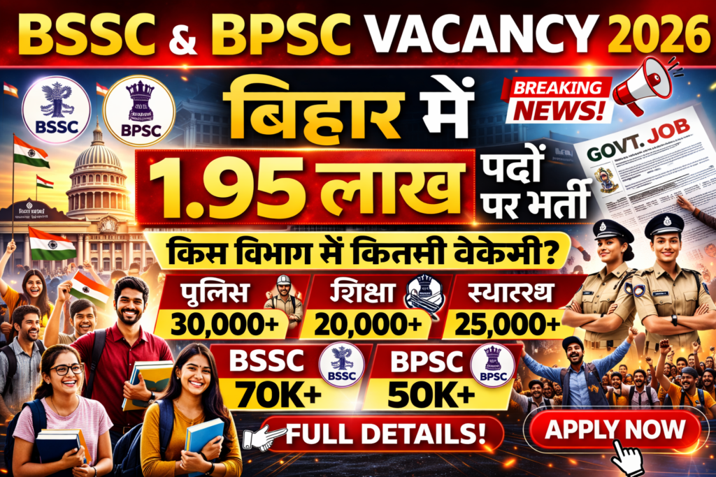 BSSC рдФрд░ BPSC Vacancy 2026 рдХреЗ рддрд╣рдд 1.95 рд▓рд╛рдЦ рдкрджреЛрдВ рдкрд░ рднрд░реНрддреА рдХреА рдЦрдмрд░ рдмрд┐рд╣рд╛рд░ рдХреЗ рдпреБрд╡рд╛рдУрдВ рдХреЗ рд▓рд┐рдП рдЙрдореНрдореАрдж рдХреА рдХрд┐рд░рдг рд╣реИред рдЕрдм рдЙрдореНрдореАрджрд╡рд╛рд░реЛрдВ рдХреЛ рдЪрд╛рд╣рд┐рдП рдХрд┐ рд╡реЗ рд╕рдордп рдмрд░реНрдмрд╛рдж рди рдХрд░реЗрдВ рдФрд░ рддреИрдпрд╛рд░реА рдореЗрдВ рдЬреБрдЯ рдЬрд╛рдПрдВред